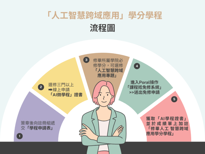 - 申請資格:無論是否申請「人工智慧跨域應用學分學程」,只需修滿三門(含)以上的AI學程內課程即可馬上申請AI微學程認證。(依成績單上的資訊為準)