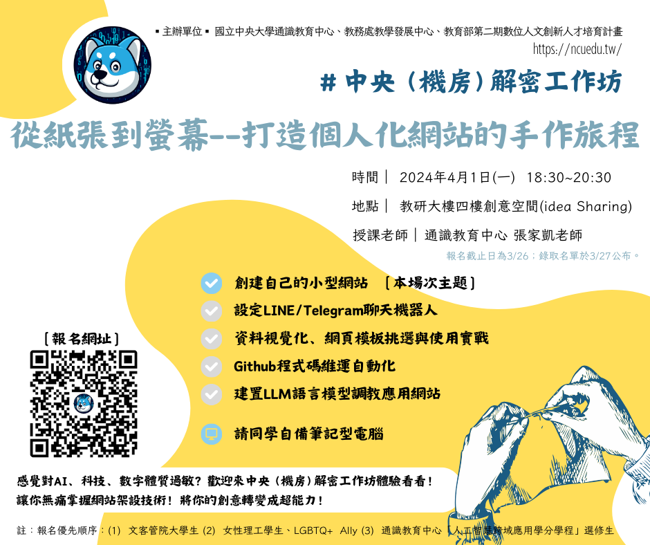 邀請無論是是科技新手、或是想嘗試卻無從入門的你來體驗看看,協助您跨越那個隱形的檻,無痛掌握網站架設技術!讓我們一起打破科技的隔閡,用你的創意搭建起通往技術世界的橋梁。加入「中央(機房)解密工作坊」,開始你的數位創作之旅。