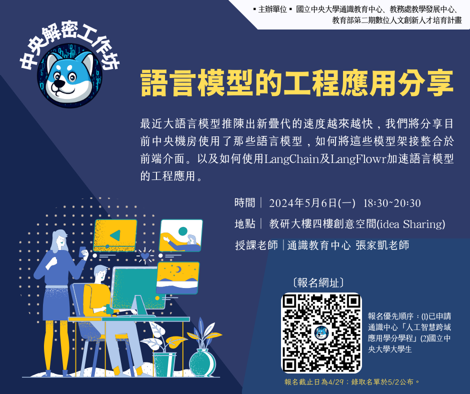 本講座將由通識教育中心張家凱助理教授來介紹如何使用生成式AI提升備課效率,包括利用「NCUEDU 中央機房 (教學實驗平台)」設計教案、創建教學材料和個性化學生學習經驗的實用方法。