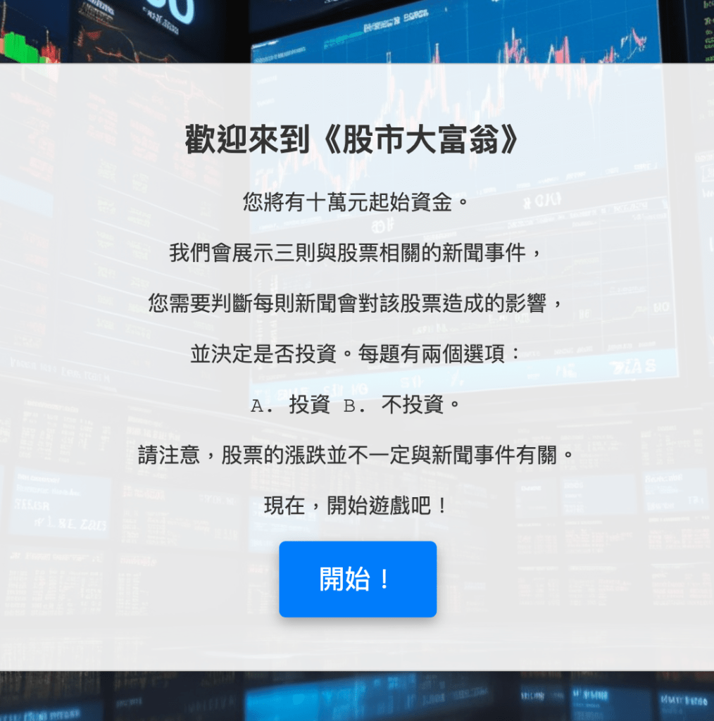 《股市大富翁》是一款模擬投資決策的互動式遊`戲,玩家需在不同情境中做出投資選擇,爭取累積最多的資金。