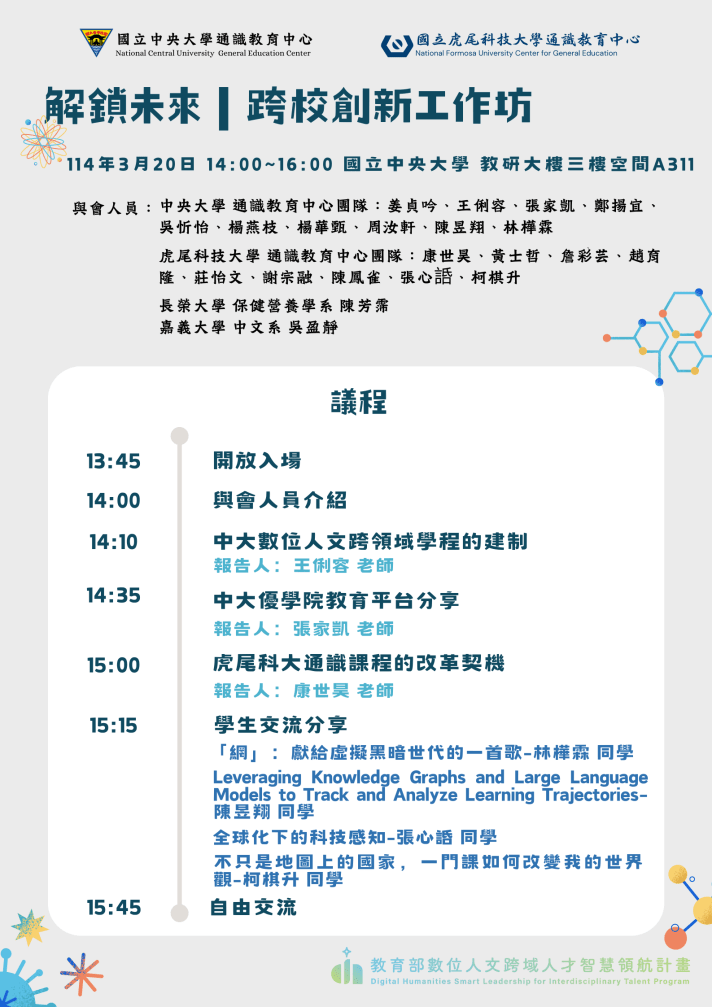 這場工作坊不僅是經驗交流的平臺,更是一場跨校教師、學生共同探索通識教育未來的實驗場。從AI技術到永續發展,從課程設計到學生作品,大家以多元視角重新詮釋通識教育的角色與價值。 未來,這樣的跨校交流將持續推進。我們也期待透過更多合作與對話,讓大學通識教育在創新中前行,真正成為連結專業與世界、技術與人文的橋樑。