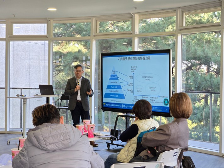 本次工作坊中也展示了許多實際教學創新案例。中央大學助理教授張家凱分享其開發的數位學習平台「優學院Uedu」,整合GPT技術打造教師專屬的數位助教。與一般ChatGPT不同,教師可自訂教材、訓練模型並限制應用範圍,使AI輔助教學更加安全可靠,並可進行學生學習歷程追蹤,協助教師精準掌握教學成效。