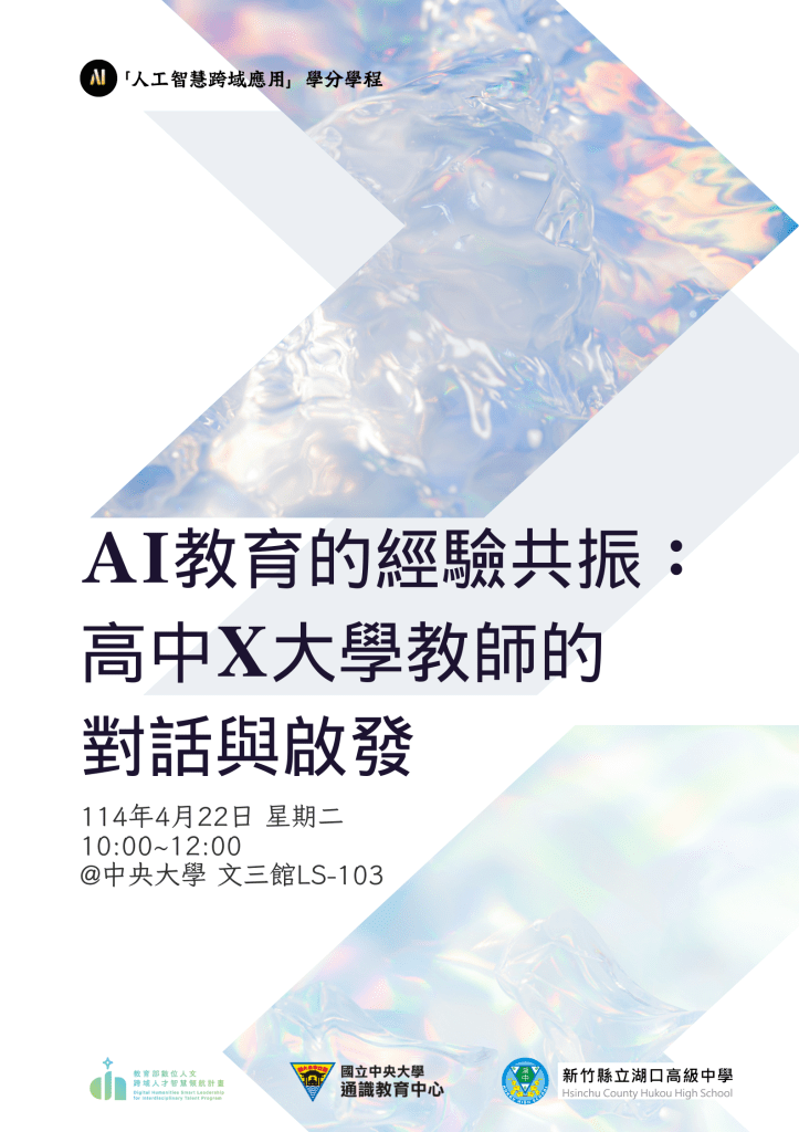 2025 年 4 月 22 日 教師社群 AI教育的經驗共振:高中X大學教師的對話與啟發 2025 年04 月22日 10:00~12:00 國立中央大學 活動花絮 其他文章 114-1課程成果|性別、科技與社會 31 十二月, 2025 114-1課程成果|科技與財富平權 31 十二月, 2025 113-2 課程成果|運算思維與程式設計應用 11 九月, 2025 相關 發表者:NCU通識教育中心 人工智慧跨域應用學分學程辦公室 檢視 NCU通識教育中心 人工智慧跨域應用學分學程辦公室 的所有文章