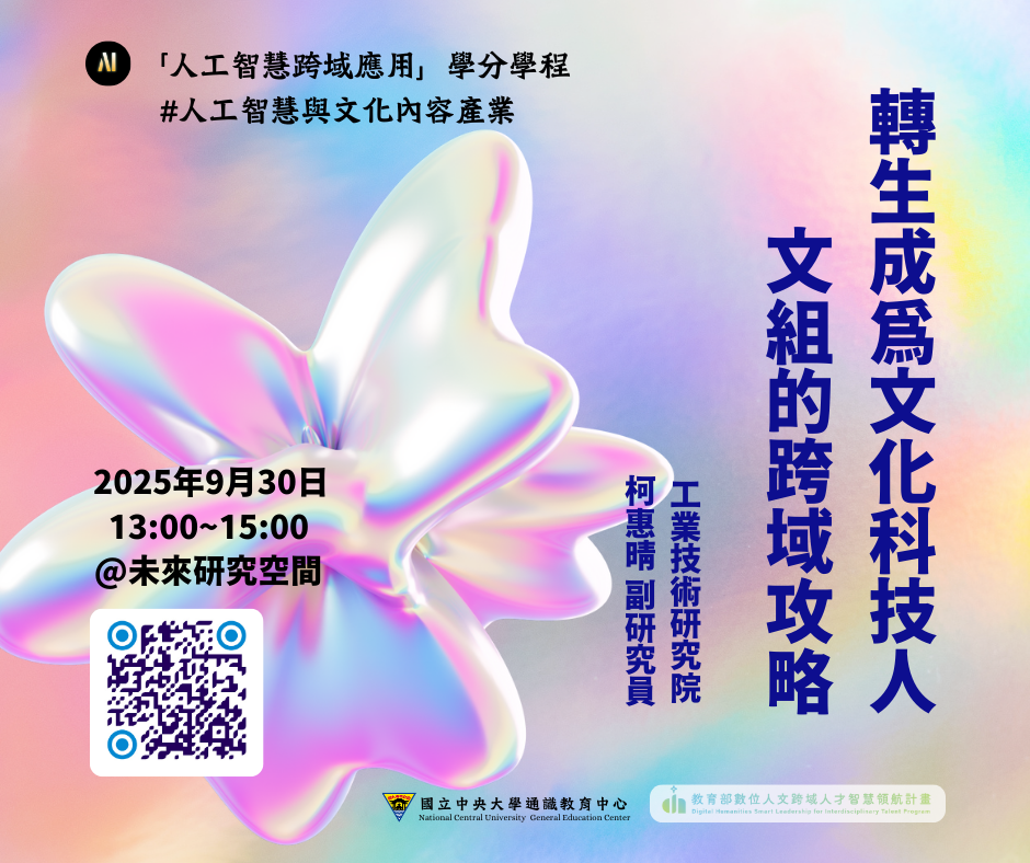 中央大學通識教育中心邀請工研院副研究員柯惠晴,分享如何將人文專業融入科技,讓你的敘事力、洞察力與溝通力成為AI時代的關鍵優勢。